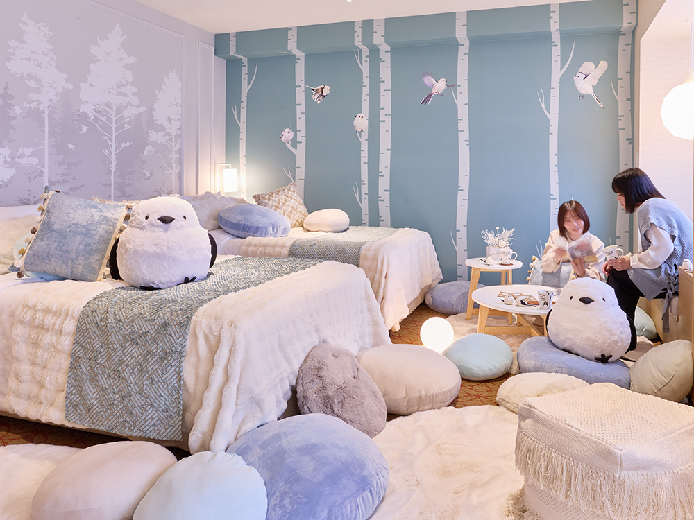 壁面はシマエナガが最も愛らしい姿を見せる「冬」を感じられるホワイト&ブルーカラーを基調とし、北海道らしい風景を落とし込んだイメージアートを配置。新たな魅力を加え、お部屋全体でシマエナガを感じていただける癒しの空間へと一新いたしました。