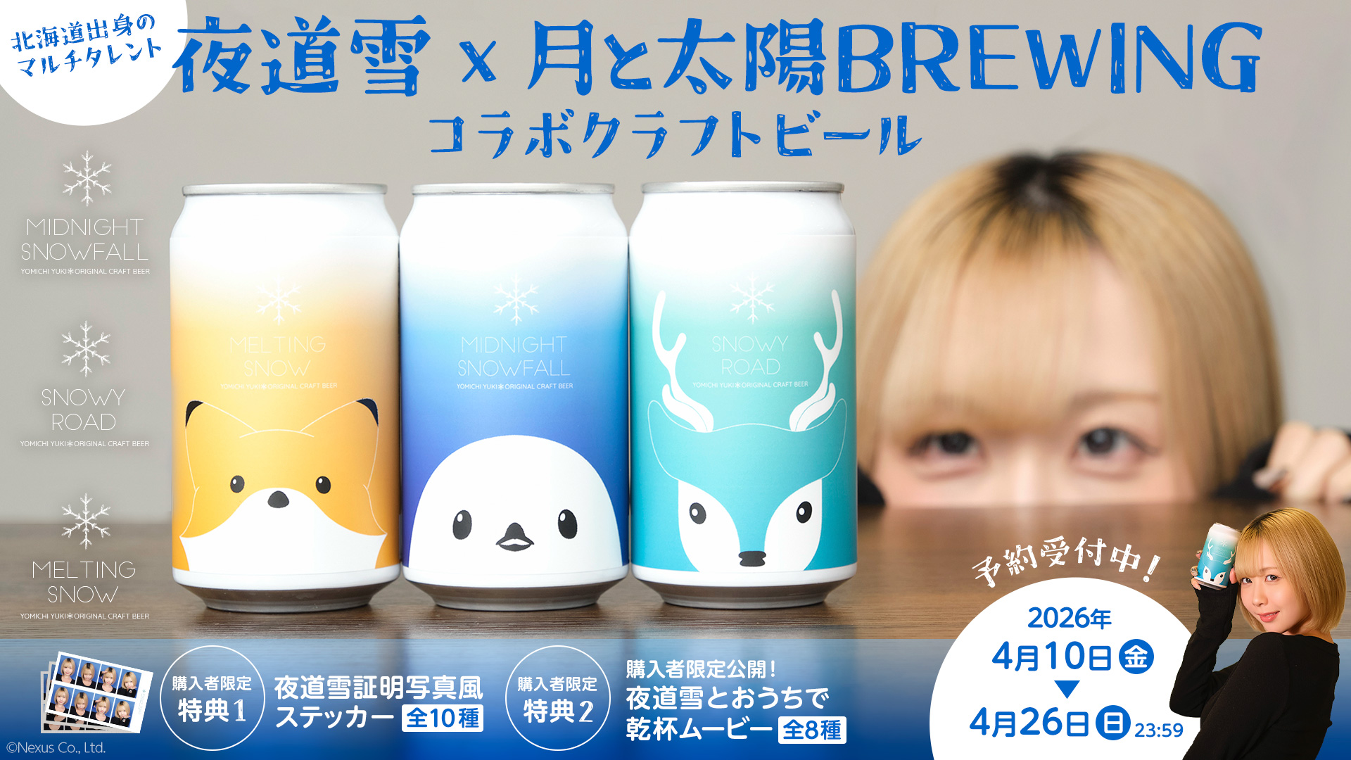 株式会社Nexus(所在地:東京都渋谷区、代表取締役:小澤正啓)は、マルチタレント『夜道雪』と、北海道のマイクロブルワリー 月と太陽BREWING(所在地:北海道札幌市、代表取締役:森谷祐至)のコラボクラフトビールを2026年4月27日(月)に発売することをお知らせいたします。